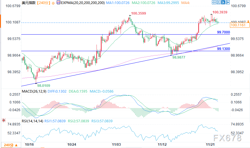 汇通财经APP讯——周一(11月24日)欧洲时段,美元指数(DXY)结束连续五个交易日的上涨态势,小幅回落至100.