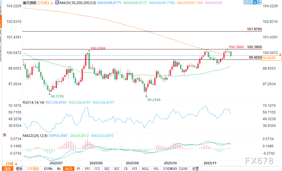 周二(11月25日)美盘时段,美元汇率持续走弱,一举跌破99.816的200日均线关键技术位,卖方牢牢掌控市场节奏。这一走势呈现明显空头特征,并未出现投资者急于抄底护盘的迹象。