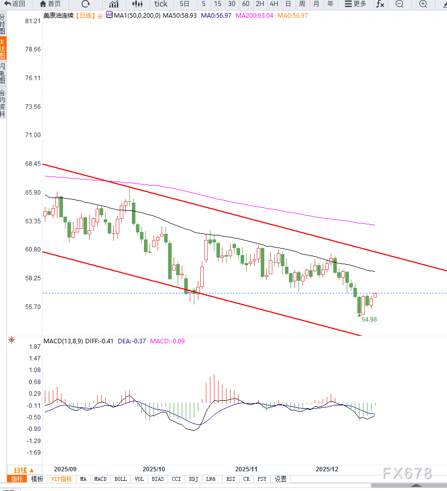 上方来看,58.00—58.50美元区域对应日线短期均线与前期密集成交区,对油价形成明显压制。