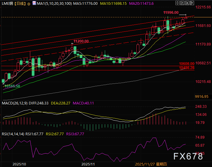 12月22日交易数据显示,铜价维持高位震荡格局:差价合约(CFD)报每磅5.5489美元(约12,233美元/吨),4小时K线微跌0.10%;LME三个月期铜收于11,881.50美元/吨(+0.88%),盘中逼近11,996美元/吨整数关口,成交量5,945手;SHFE主力合约涨1.36%至93,980元/吨(约13,348美元/吨),内外盘价差反映区域供需差异。