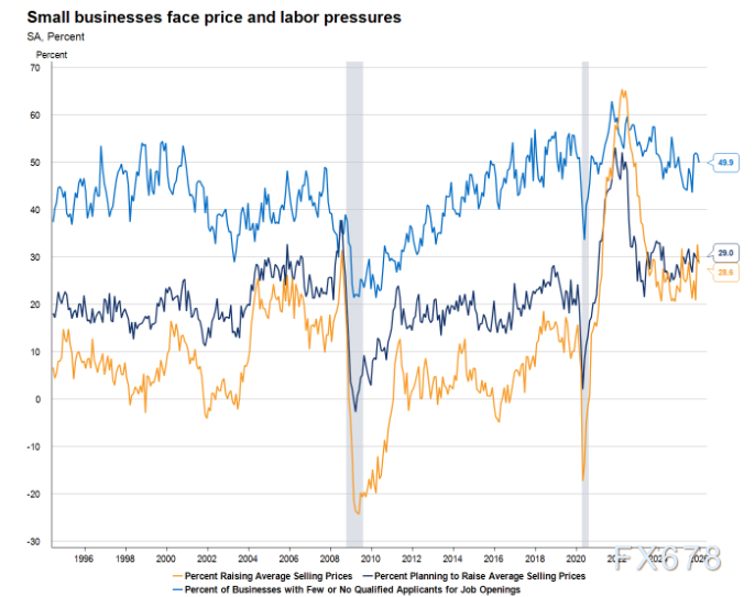 事实上,NFIB的小企业调查显示,占比居高不下的企业反馈三大现状:其一,已完成产品价格上调;其二,计划持续涨价;其三,即便近期市场表现偏弱,企业仍难以招聘到合格劳动力。