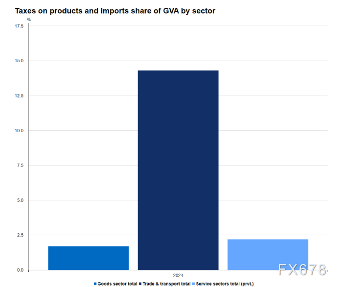 从总增加值(GVA)占比,即各板块对GDP的贡献维度来看,雇员薪酬占服务行业投入成本的49%,而商品行业的这一比例为46%。