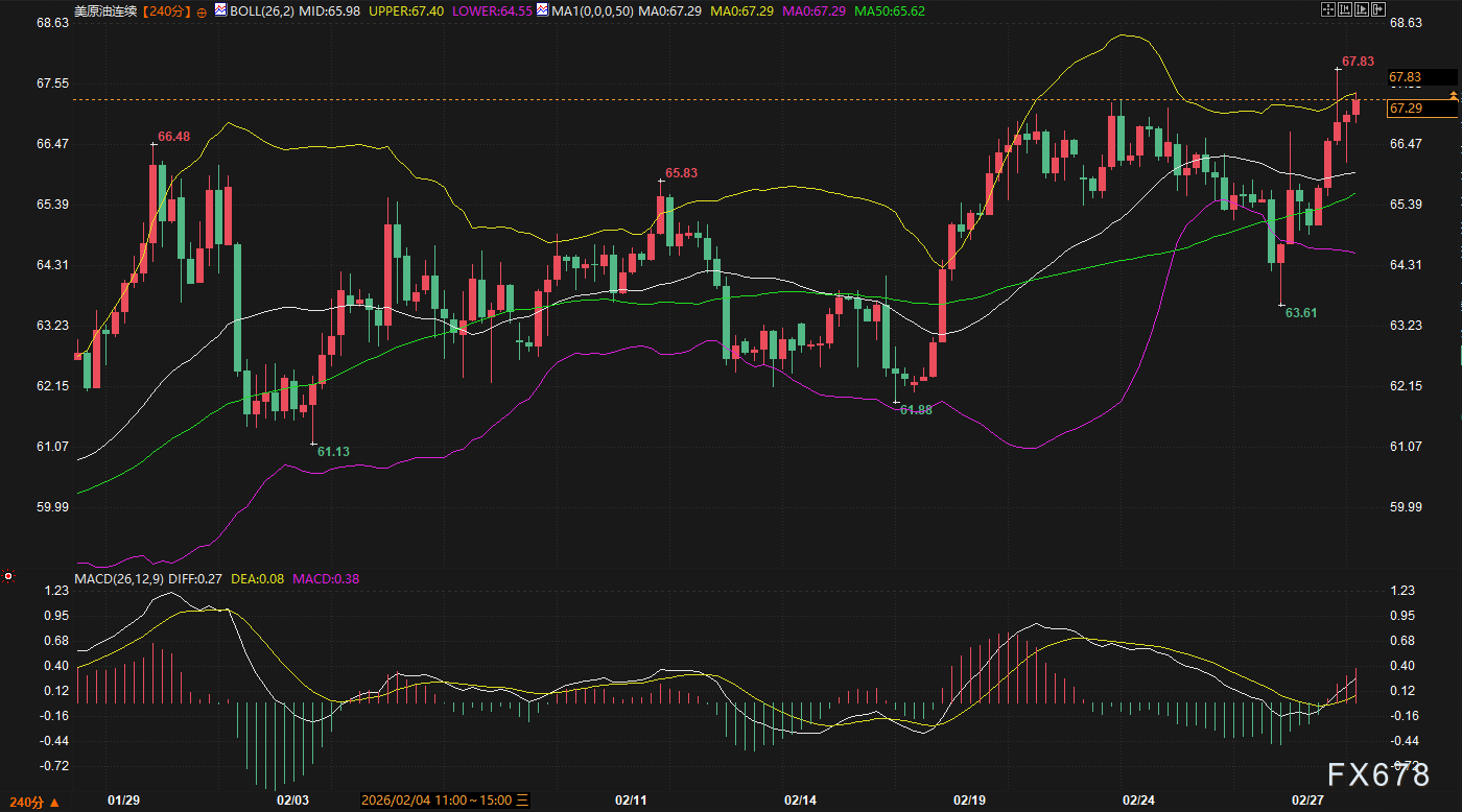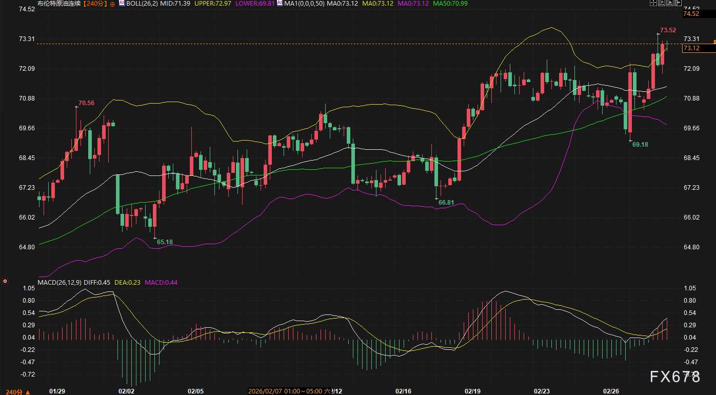 一、 事件进展:从边境摩擦到“中枢打击”的定点升级 此次局势的恶化并非传统的代理人冲突,而是直接针对主权国家核心领导层的中枢打击。以下是截至周日上午的最新进展逻辑梳理: 1. 核心人物陨落与信息迷雾 根据权威媒体及多方消息来源确认,伊朗最高领袖哈梅内伊在美以联合行动中身亡。尽管伊朗官方曾试图通过“心理战”说辞进行安抚,但随着以色列国防军公布相关高级官员及哈梅内伊亲属被清除的照片,信息的真实性正不断被盘面预期的确定性所取代。 2. 继任者悬念与强硬派掌权预期 知名机构的最新评估指出,即使哈梅内伊丧生,伊朗政权并不会立即崩溃,反而可能由伊斯兰革命卫队(IRGC)的强硬派人物接管。潜在继任者如穆杰塔巴·哈梅内伊与革命卫队关系密切,这预示着伊朗未来的对外政策将更具对抗性。 3. “能源咽喉”的实质性瘫痪 目前最令市场战栗的信号是霍尔木兹海峡的状态。尽管英国海事部门称海峡仍开放,但实测数据显示周边油轮航速已普遍降至零。大量油轮停航避险,意味着全球约20%的石油供应通道已陷入实质性瘫痪。这一事实而非声明,将成为周一油价跳空高开的直接诱因。 二、 盘面分析:技术面与基本面的深度共振 exness官网:当前市场正处于“极度风险厌恶”状态。我们需要结合周五的K线数据与周末的突发基本面,对各主要品种进行逻辑衔接。 1. 能源市场:布油、美油的“战时溢价” 技术面背景: 布伦特原油(参考合约:连续):周五报收73.12美元,已突破布林带上轨(72.97)。MACD多头动能延续,MA50(70.99)提供强支撑。 WTI原油(参考合约:连续):报收67.29美元,MACD金叉明确。